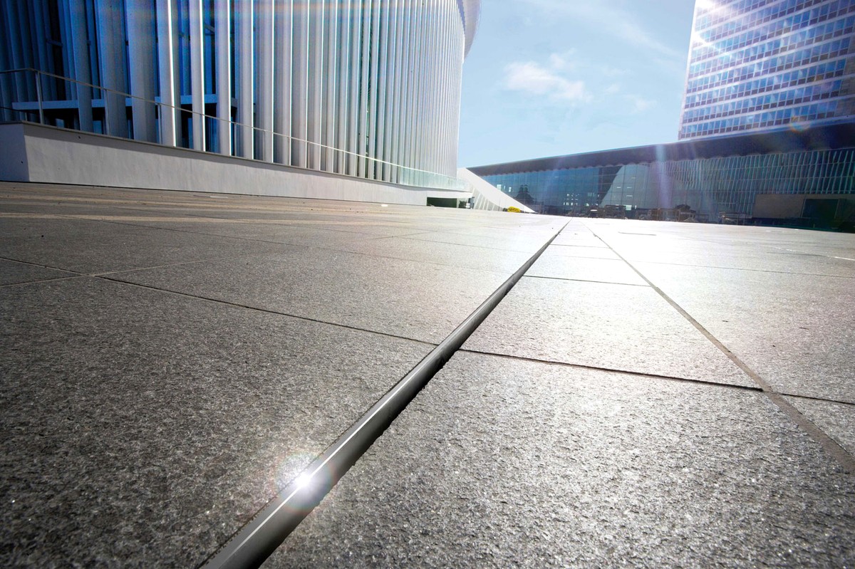 Der Europaplatz (Place de l'Europe) ist ein zentraler Platz im Europaviertel (Quertie Européen Sud) des Kirchberg-Plateaus in der luxemburgischen Hauptstadt. Die dreieckige Form der Place de l'Europe (die einst ein offener Parkplatz am Fuße des Alcide-De-Gasperi-Turms war) wurde vom katalanischen Architekten Ricardo Bofill 2004 entworfen. Der Platz ist umgeben von dunklen, in zurückhaltender Architektur gebauten Gebäuden, das Hauptelement ist die im Zentrum gelegene Philharmonie. ANRIN lieferte hier die Schlitzaufsatzrinnen aus hochwertigem Edelstahl, ein Entwässerungssystem für den gehobenen Anspruch nach ästhetischen Lösungen. Es besteht aus dem eigentlichen Rinnenkörper aus Polymerbeton und einem sogenannten Schlitzaufsatz aus verzinktem Stahl oder Edelstahl. Dieser wird von 2 gekanteten Blechen gebildet. Der Schaft mündet in einem schmalen Schlitz. Die Bleche werden beim Einbau mit Platten oder Pflaster belegt, sodass nur der Schlitz an der Oberfläche sichtbar bleibt. Dieses Rinnensystem findet vor allem in der repräsentativen Gestaltung von Plätzen und urbanen Flächen im Städtebau Verwendung und ist für Verkehrslasten von bis zu D400* geeignet.