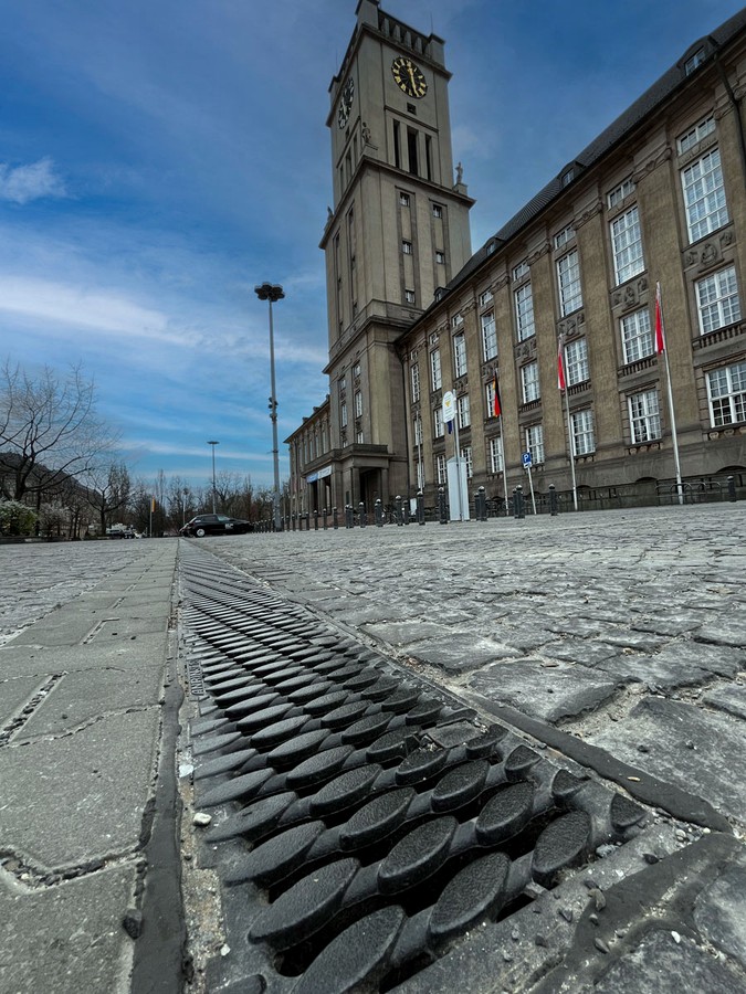 Für das Bauvorhaben „Rathaus am John-F.-Kennedy-Platz“ in Berlin-Schöneberg wurden ANRIN Entwässerungsrinnen Typ SF-150 eingesetzt. Dieses Schwerlastrinnensystem mit einer Nennweite von 150 mm ist speziell für extreme Belastungen an hoch frequentierten Orten konzipiert und bis zur höchsten Belastungsklasse F 900 nach DIN EN 1433 freigegeben. Die verbauten Rinnensysteme bestehen aus robustem Polymerbeton und verfügen über eingegossene Zargen aus duktilem Gusseisen. Sie verleihen den Rinnen die Stabilität, die sie brauchen, um die hohen Belastungen beim Überfahren mit schweren Fahrzeugen aufzufangen. So trägt die ANRIN SF-150 am John-F.-Kennedy-Platz in Berlin zur zuverlässigen Entwässerung und Langlebigkeit der Infrastruktur des Rathauses bei.