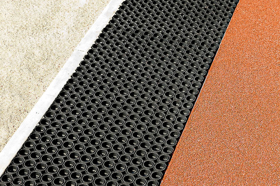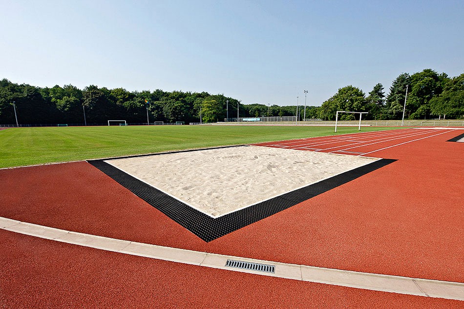 ANRIN SPORT Weichkantensteine aus Polymerbeton mit EPDM-Gummiprofil in schwarz oder weiß eignen sich besonders für die Randeinfassung von Laufbahnen, zur Abgrenzung von Spielfeldern gegen Segmentbereiche und zur Sprung- oder Stoßgrubeneinfassung. Das Gummiprofil ist in Polymerbeton eingegossen und bietet aufgrund der Elastizität des Materials und der abgerundeten Kanten ein Höchstmaß an aktiver Sicherheit. Breiten von 6 cm für Sprunggruben und Beachvolleyballfelder bis 10 cm für Kugelstoßanlagen und Bauhöhen von 20 bis 40 cm bieten eine Vielfalt an individuellen Konstruktions- und Gestaltungsmöglichkeiten